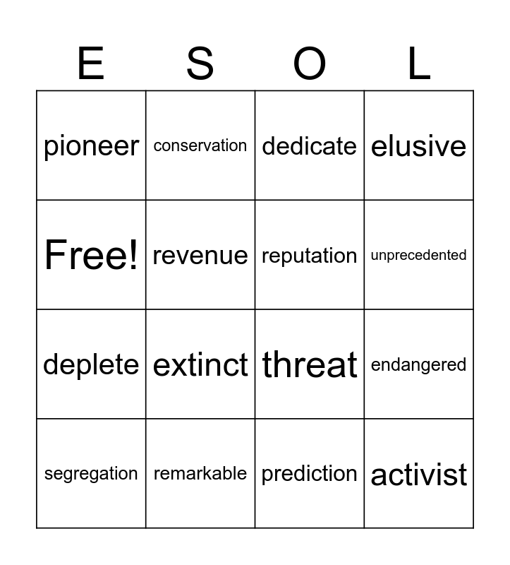 This bingo card has 16 words: remarkable, endangered, dedicate, pioneer, deplete, conservation, threat, prediction, Free!, revenue, segregation, elusive, extinct, unprecedented, reputation and activist.