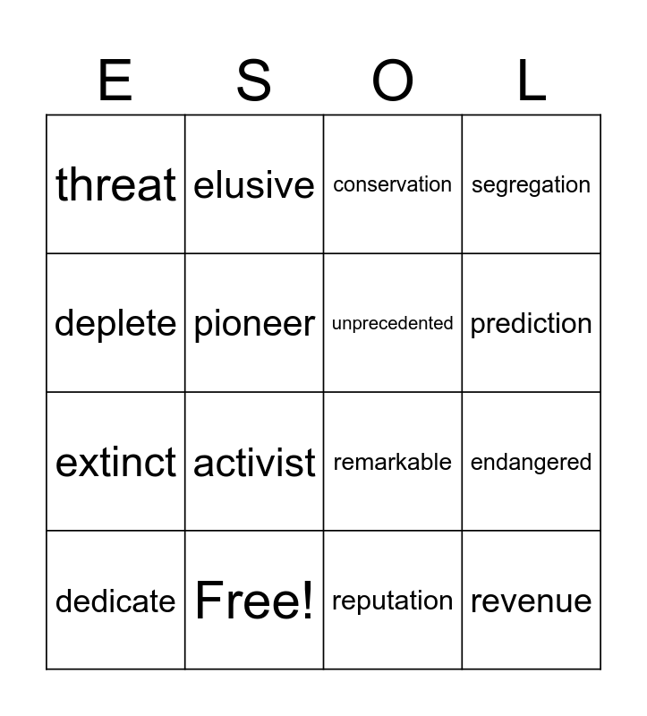 This bingo card has 16 words: Free!, endangered, conservation, threat, extinct, elusive, remarkable, reputation, deplete, pioneer, dedicate, segregation, activist, prediction, unprecedented and revenue.