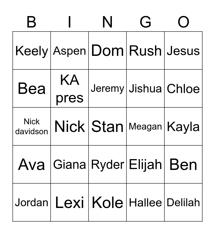 This bingo card has a free space and 24 words: Giana, Lexi, Jeremy, Jordan, Jesus, Keely, Bea, Aspen, Meagan, Ryder, Jishua, Nick davidson, Elijah, Ben, KA pres, Hallee, Kayla, Dom, Chloe, Nick, Delilah, Ava, Rush and Kole.
