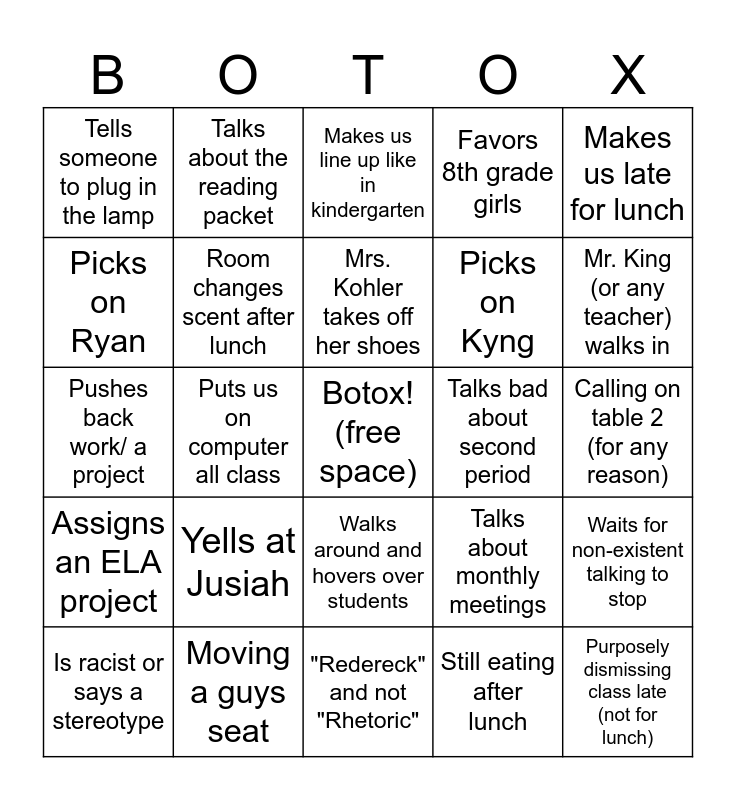 This bingo card has a free space and 24 words: Yells at Jusiah, Moving a guys seat, Mrs. Kohler takes off her shoes, Is racist or says a stereotype, Makes us late for lunch, Tells someone to plug in the lamp, Picks on Ryan, Talks about the reading packet, Talks bad about second period, Walks around and hovers over students, Picks on Kyng, Pushes back work/ a project, Talks about monthly meetings, Waits for non-existent talking to stop, Room changes scent after lunch, Still eating after lunch, Calling on table 2 (for any reason), Makes us line up like in kindergarten, Mr. King (or any teacher) walks in, Puts us on computer all class, Purposely dismissing class late (not for lunch), Assigns an ELA project, Favors 8th grade girls and "Redereck" and not "Rhetoric".
