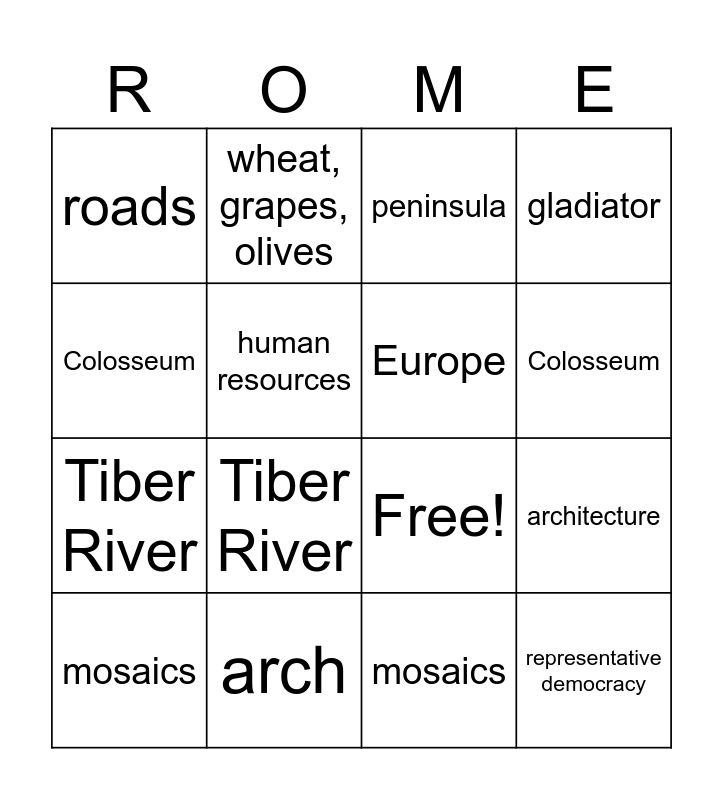 ⚠ This card has duplicate items: mosaics (2), Colosseum (2), Tiber River (2), architecture (2), human resources (2)