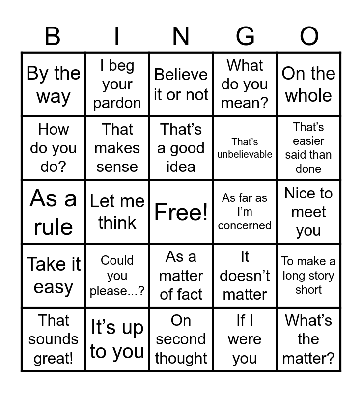 This bingo card has a free space and 68 words: Excuse me, What’s the matter?, No worries, I have no idea, I’m sorry, As far as I know, I beg your pardon, In the meantime, That’s a good idea, To be honest, As a matter of fact, On the other hand, Nice to meet you, On the whole, What’s up?, How do you do?, Let me think, By the way, In other words, Could you please...?, That’s unbelievable, It doesn’t matter, Take it easy, How’s it going?, At the end of the day, I don’t believe it!, I’m afraid not, It seems like, To make a long story short, In the long run, Believe it or not, By all means, At the moment, Come to think of it, What do you mean?, I wouldn’t say that, It’s not my cup of tea, That sounds great!, That’s easier said than done, As a rule, You’ve got a point, The thing is, That makes sense, Just in case, You’re telling me!, That’s a good point, To cut a long story short, No doubt about it, As far as I’m concerned, It’s up to you, Let me put it this way, It’s not worth it, I see your point, On second thought, That’s just what I needed, In no time, If I were you, It’s not my thing, I don’t think so, Not necessarily, In the first place, It goes without saying, As luck would have it, I’m with you on that, Don’t get me wrong, What’s the catch?, You’ve got to be kidding and There’s no point in.