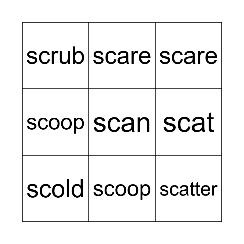 ⚠ This card has duplicate items: scan (3), scab (3), scene (3), scrub (3), scar (3), scold (3), score (3), scatter (3), scout (3), scoop (3), scalp (3), scarf (3), scare (3), school (3), scale (2)