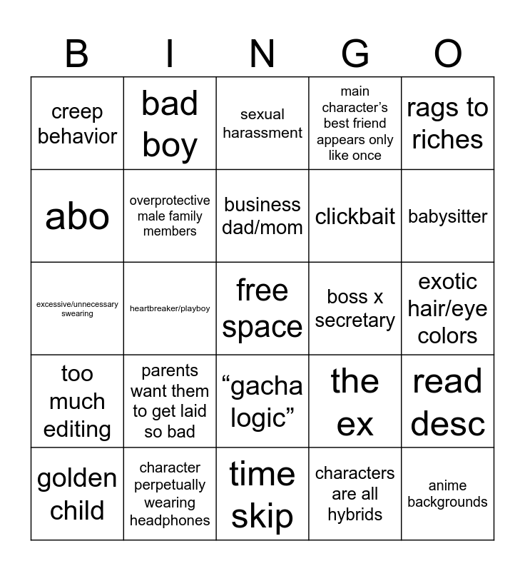 This bingo card has a free space and 33 words: character introduction, intro/outro, heartbreaker/playboy, kinemaster, too much editing, overprotective male family members, rags to riches, golden child, bad boy, boy in an all girl school 😱, business dad/mom, sexual harassment, jealousy, special font used in the title, boss x secretary, babysitter, character perpetually wearing headphones, excessive/unnecessary swearing, parents want them to get laid so bad, the ex, “gacha logic”, multiple parts, creep behavior, exotic hair/eye colors, time skip, anime backgrounds, main character’s best friend appears only like once, clickbait, abo, read desc, the creator is an extra, characters are all hybrids and mistakes lollipop for cigarette.