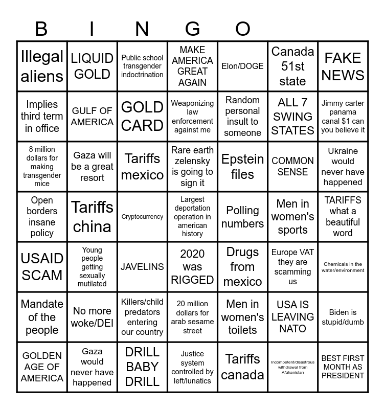 This bingo card has 49 words: USA IS LEAVING NATO, ALL 7 SWING STATES, Tariffs canada, Tariffs china, Tariffs mexico, TARIFFS what a beautiful word, LIQUID GOLD, DRILL BABY DRILL, Canada 51st state, 2020 was RIGGED, FAKE NEWS, MAKE AMERICA GREAT AGAIN, COMMON SENSE, Epstein files, No more woke/DEI, Men in women's sports, Implies third term in office, Jimmy carter panama canal $1 can you believe it, Biden is stupid/dumb, Elon/DOGE, Random personal insult to someone, Cryptocurrency, Illegal aliens, GULF OF AMERICA, GOLDEN AGE OF AMERICA, GOLD CARD, Ukraine would never have happened, Gaza would never have happened, Rare earth zelensky is going to sign it, Gaza will be a great resort, BEST FIRST MONTH AS PRESIDENT, Polling numbers, Mandate of the people, Killers/child predators entering our country, Open borders insane policy, Drugs from mexico, Europe VAT they are scamming us, Chemicals in the water/environment, 8 million dollars for making transgender mice, JAVELINS, 20 million dollars for arab sesame street, USAID SCAM, Largest deportation operation in american history, Justice system controlled by left/lunatics, Weaponizing law enforcement against me, Public school transgender indoctrination, Men in women's toilets, Young people getting sexually mutilated and Incompetent/disastrous withdrawal from Afghanistan.