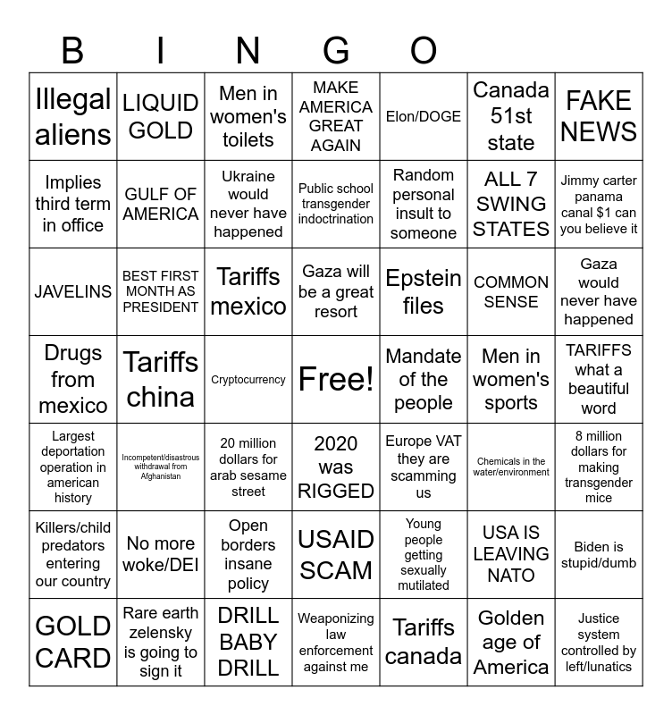 This bingo card has a free space and 49 words: USA IS LEAVING NATO, ALL 7 SWING STATES, Tariffs canada, Tariffs china, Tariffs mexico, TARIFFS what a beautiful word, LIQUID GOLD, DRILL BABY DRILL, Canada 51st state, 2020 was RIGGED, FAKE NEWS, MAKE AMERICA GREAT AGAIN, COMMON SENSE, Epstein files, No more woke/DEI, Men in women's sports, Implies third term in office, Jimmy carter panama canal $1 can you believe it, Biden is stupid/dumb, Elon/DOGE, Random personal insult to someone, Cryptocurrency, Illegal aliens, GULF OF AMERICA, GOLD CARD, Ukraine would never have happened, Gaza would never have happened, Rare earth zelensky is going to sign it, Gaza will be a great resort, BEST FIRST MONTH AS PRESIDENT, Polling numbers, Mandate of the people, Killers/child predators entering our country, Open borders insane policy, Drugs from mexico, Europe VAT they are scamming us, Chemicals in the water/environment, 8 million dollars for making transgender mice, JAVELINS, 20 million dollars for arab sesame street, USAID SCAM, Largest deportation operation in american history, Justice system controlled by left/lunatics, Weaponizing law enforcement against me, Public school transgender indoctrination, Men in women's toilets, Young people getting sexually mutilated, Incompetent/disastrous withdrawal from Afghanistan and Golden age of America.