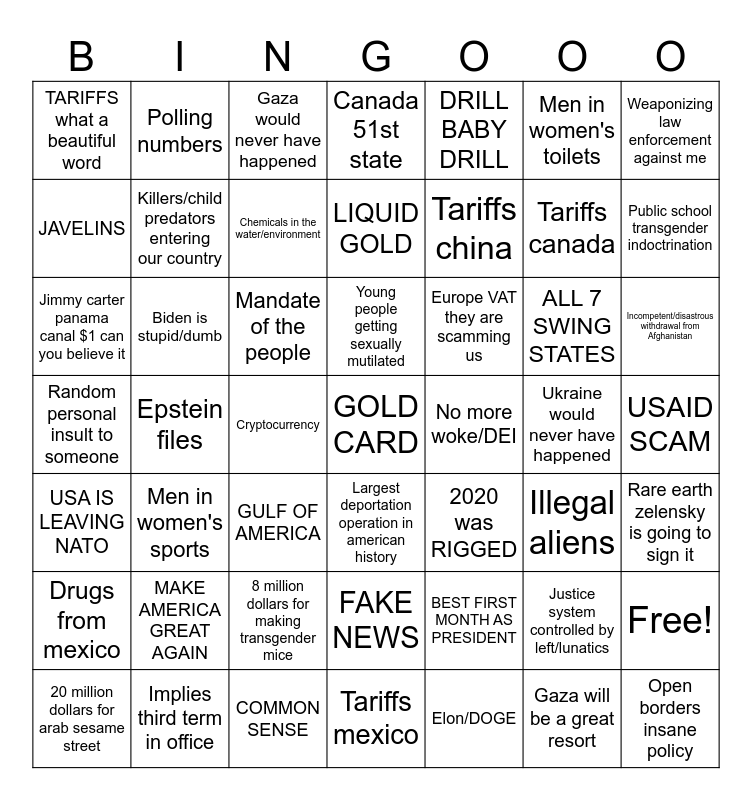 This bingo card has 50 words: Free!, Tariffs canada, Gaza will be a great resort, Epstein files, Mandate of the people, Largest deportation operation in american history, Polling numbers, Tariffs mexico, Men in women's toilets, 2020 was RIGGED, Weaponizing law enforcement against me, Canada 51st state, ALL 7 SWING STATES, Europe VAT they are scamming us, 8 million dollars for making transgender mice, USAID SCAM, JAVELINS, Public school transgender indoctrination, 20 million dollars for arab sesame street, DRILL BABY DRILL, Tariffs china, Cryptocurrency, TARIFFS what a beautiful word, Killers/child predators entering our country, Implies third term in office, GOLD CARD, Chemicals in the water/environment, COMMON SENSE, Gaza would never have happened, Young people getting sexually mutilated, Golden age of America, USA IS LEAVING NATO, MAKE AMERICA GREAT AGAIN, FAKE NEWS, Random personal insult to someone, Ukraine would never have happened, Illegal aliens, Rare earth zelensky is going to sign it, Drugs from mexico, Jimmy carter panama canal $1 can you believe it, GULF OF AMERICA, BEST FIRST MONTH AS PRESIDENT, Men in women's sports, Elon/DOGE, Incompetent/disastrous withdrawal from Afghanistan, LIQUID GOLD, No more woke/DEI, Justice system controlled by left/lunatics, Biden is stupid/dumb and Open borders insane policy.