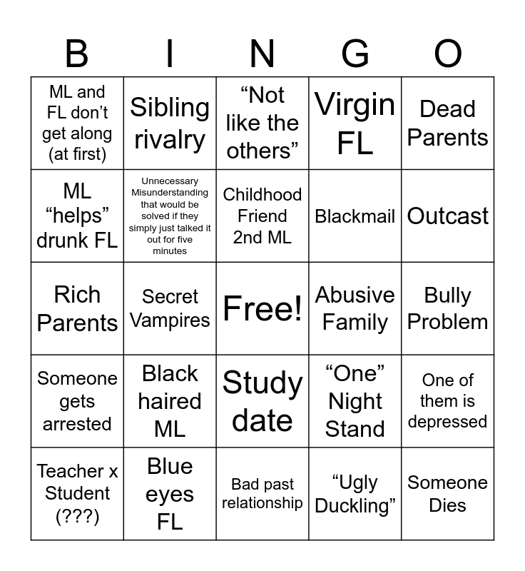 This bingo card has a free space and 24 words: Black haired ML, Blue eyes FL, Childhood Friend 2nd ML, Teacher x Student (???), Dead Parents, ML and FL don’t get along (at first), ML “helps” drunk FL, Sibling rivalry, Abusive Family, Study date, Blackmail, Rich Parents, “One” Night Stand, One of them is depressed, Unnecessary Misunderstanding that would be solved if they simply just talked it out for five minutes, “Ugly Duckling”, Bully Problem, “Not like the others”, Outcast, Secret Vampires, Someone Dies, Someone gets arrested, Virgin FL and Bad past relationship.