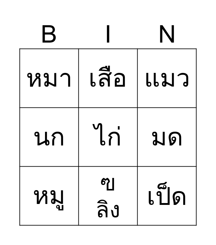 This bingo card has a free space and 8 words: มด, แมว, เสือ, หมู, หมา, เป็ด, นก and ฃ ลิง.