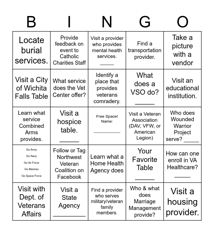 This bingo card has a free space and 24 words: Follow or Tag Northwest Veteran Coalition on Facebook, Visit a State Agency _________, Identify a place that provides veterans comradery., Visit with Dept. of Veterans Affairs, Take a picture with a vendor, Locate burial services., Visit a City of Wichita Falls Table, Provide feedback on event to Catholic Charities Staff, Visit a Veteran Association (DAV, VFW, or American Legion), Learn what a Home Health Agency does, What does a VSO do? _____, Learn what service Combined Arms provides., Your Favorite Table _____, How can one enroll in VA Healthcare? _____, What service does the Vet Center offer?, Who & what does Marriage Management provide?, Who does Wounded Warrior Project serve? _____, Visit a provider who provides mental health services. _____, Visit an educational institution., Visit a hospice table. _____, Visit a housing provider., Go Army Go Navy Go Air Force Go Marines Go Space Force, Find a transportation provider. and Find a provider who serves military/veteran family members..