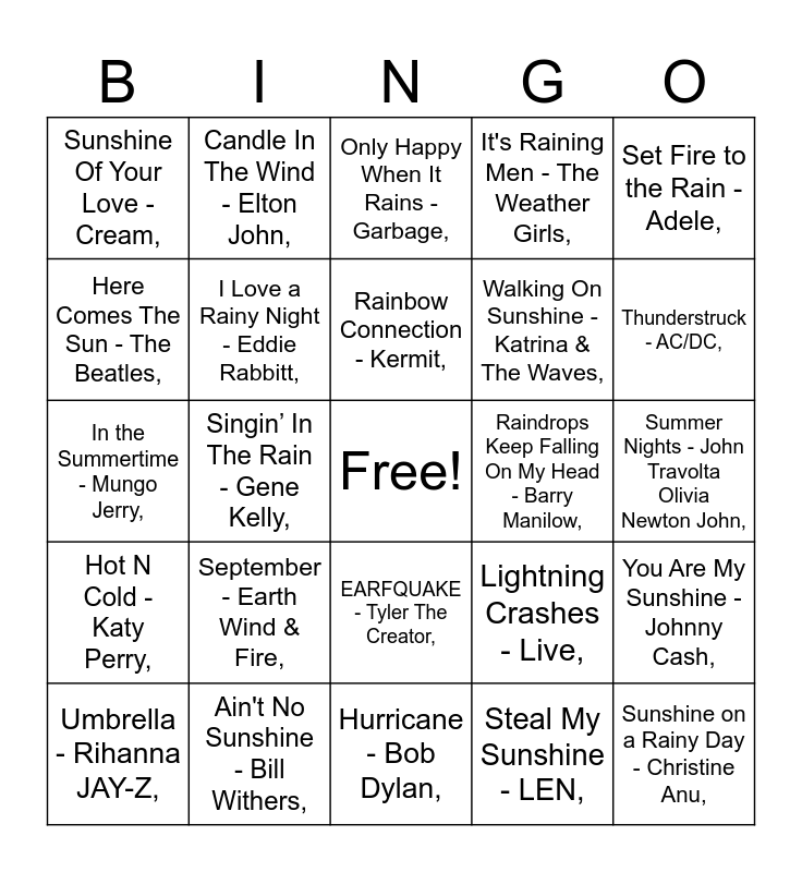 This bingo card has a free space and 48 words: Rain - Dragon,, Sunshine on a Rainy Day - Christine Anu,, After The Storm - Kali Uchis Tyler The Creator,, Hurricane - Bob Dylan,, September - Earth Wind & Fire,, Blue Skies - Willie Nelson,, Candle In The Wind - Elton John,, Over the Rainbow - Israel Kamaka wiwoole,, Here Comes The Sun - The Beatles,, Rock You Like A Hurricane - Scorpions,, I Love a Rainy Night - Eddie Rabbitt,, It's Raining Men - The Weather Girls,, You Are My Sunshine - Johnny Cash,, Lightning Crashes - Live,, Ride The Lightning - Metallica,, November Rain - Guns N Roses,, Rainbow Connection - Kermit,, Raindrops Keep Falling On My Head - Barry Manilow,, Riders on the Storm - The Doors,, Set Fire to the Rain - Adele,, Singin’ In The Rain - Gene Kelly,, Steal My Sunshine - LEN,, Sunshine Of Your Love - Cream,, Walking On Sunshine - Katrina & The Waves,, The Tide Is High - Blondie,, Thunderstruck - AC/DC,, Umbrella - Rihanna JAY-Z,, Black Hole Sun - Soundgarden,, EARFQUAKE - Tyler The Creator,, Hot N Cold - Katy Perry,, Hot In Herre - Nelly,, California Dreamin - The Mamas & The Papas,, We Didn't Start the Fire - Billy Joel,, Cold as Ice - Foreigner,, Ain't No Sunshine - Bill Withers,, Summertime Sadness - Lana Del Rey,, Heat Waves - Glass Animals,, Summer Nights - John Travolta Olivia Newton John,, I Can See Clearly Now - Johnny Nash,, Weather With You - Crowded House,, All Summer Long - Kid Rock,, Island In The Sun - Weezer,, Only Happy When It Rains - Garbage,, Why Does It Always Rain On Me? - Travis,, In the Summertime - Mungo Jerry,, Sun Is Shining - Bob Marley & The Wailers,, Sunny - Boney M, and Dancing in the Moonlight - Toploader,.