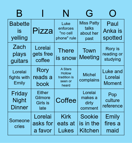 This bingo card has 31 words: Kirk eats at Lukes, Rory acts awkward, Rory reads a book, Poptarts, Babette is yelling, Luke enforces "no cell phone" rule, Lorelai gets free coffee, Lorelai makes a dirty comment, Michel complains, Sookie is in the Kitchen, Luke and Lorelai Moment, A Stars Hollow tradition is seen or heard, Emily fires a maid, Luke and Taylor have a fight, Rory is reading or studying, Rory and Lorelai eat a meal without nutrition, Pop culture reference, Either Gilmore Girls is late, Friday Night Dinner, Coffee, Paul Anka is spotted, Kim's Antiques, Someone cries, Pizza, Town Meeting, Zach plays guitars, Miss Patty talks about her past, Lorelai fights with Emily, Lorelai asks for a favor, There is snow and Al's Pancake World is mentioned.