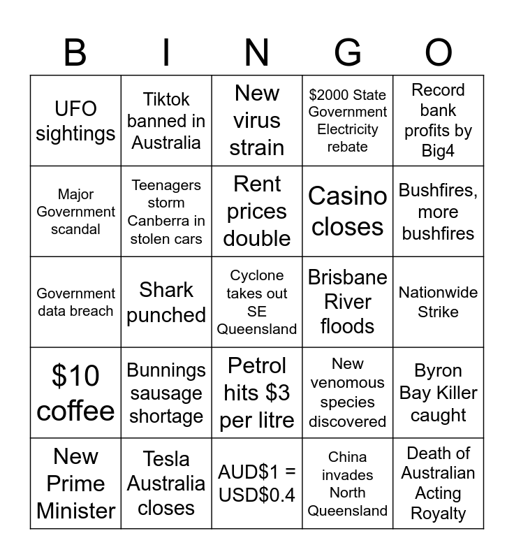 This bingo card has a free space and 24 words: Bunnings sausage shortage, Tesla Australia closes, Rent prices double, New Prime Minister, Record bank profits by Big4, UFO sightings, Major Government scandal, Tiktok banned in Australia, Brisbane River floods, Petrol hits $3 per litre, Casino closes, Government data breach, New venomous species discovered, Byron Bay Killer caught, Teenagers storm Canberra in stolen cars, China invades North Queensland, Nationwide Strike, New virus strain, Bushfires, more bushfires, Shark punched, Death of Australian Acting Royalty, $10 coffee, $2000 State Government Electricity rebate and AUD$1 = USD$0.4.