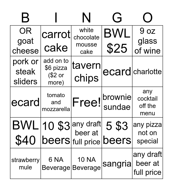 This bingo card has a free space and 24 words: 10 $3 beers, 6 NA Beverage, tavern chips, strawberry mule, 9 oz glass of wine, OR goat cheese, pork or steak sliders, carrot cake, brownie sundae, any draft beer at full price, ecard, ecard, 5 $3 beers, any pizza not on special, add on to $6 pizza ($2 or more), sangria, any cocktail off the menu, white chocolate mousse cake, charlotte, tomato and mozzarella, any draft beer at full price, BWL $40, BWL $25 and 10 NA Beverage.