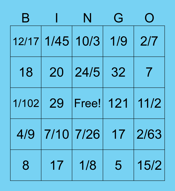 This bingo card has a free space and 24 words: 7/10, 17, 24/5, 8, 2/7, 12/17, 18, 1/45, 121, 7/26, 32, 1/102, 17, 2/63, 20, 5, 11/2, 10/3, 7, 29, 15/2, 4/9, 1/9 and 1/8.