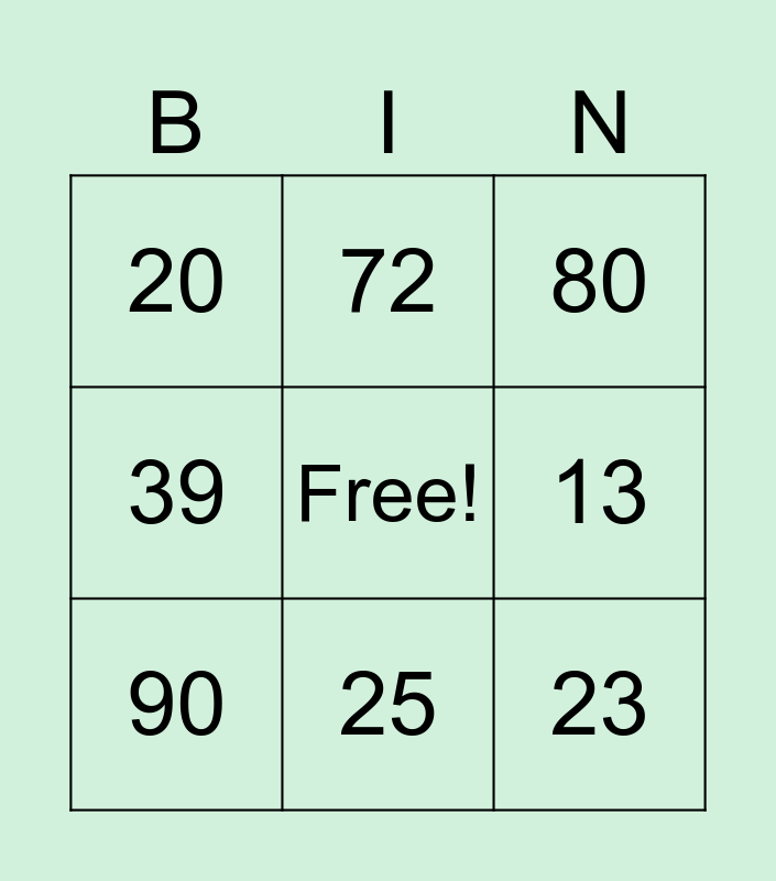 This bingo card has a free space and 8 words: 13, 80, 72, 90, 20, 23, 39 and 25.