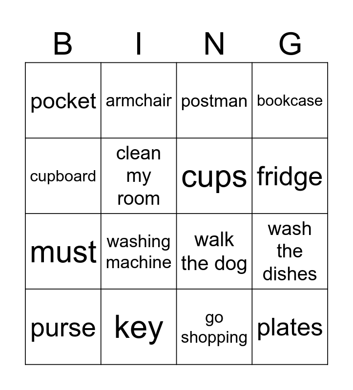 This bingo card has 16 words: key, wash the dishes, postman, pocket, must, armchair, walk the dog, go shopping, cupboard, clean my room, purse, bookcase, washing machine, fridge, cups and plates.