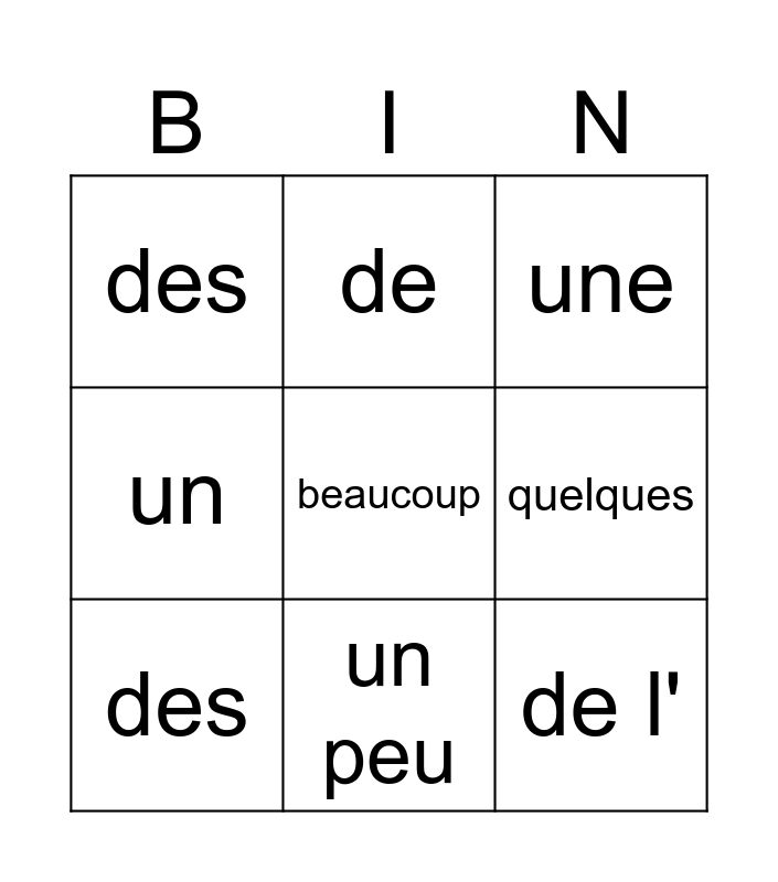 This bingo card has a free space and 23 words: de la, du, un peu, des, de l', des, quelques, de, de la, beaucoup, du, des, quelques, du, quelques, de la, une, de l', des, de l', un, un peu and de.