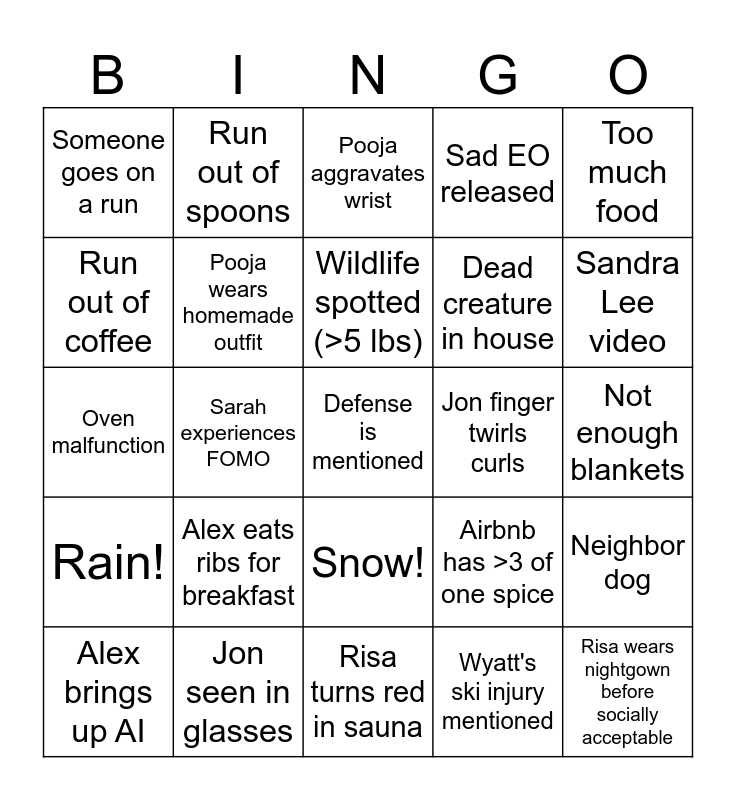 This bingo card has a free space and 29 words: Alex brings up AI, Sarah experiences FOMO, Sarah experiences FOMO, Cat hair on non-cat owner, Someone goes on a run, Pooja aggravates wrist, Pooja wears homemade outfit, Alex eats ribs for breakfast, Jon finger twirls curls, Jon seen in glasses, Not enough blankets, Risa wears nightgown before socially acceptable, Risa turns red in sauna, Wyatt's ski injury mentioned, Sandra Lee video, Jen watches Comet cam, Snow!, Rain!, Too much food, Oven malfunction, Airbnb has >3 of one spice, Forgot toothpaste, Dead creature in house, Run out of coffee, Sad EO released, Run out of spoons, Neighbor dog, Wildlife spotted (>5 lbs) and Shooting star.