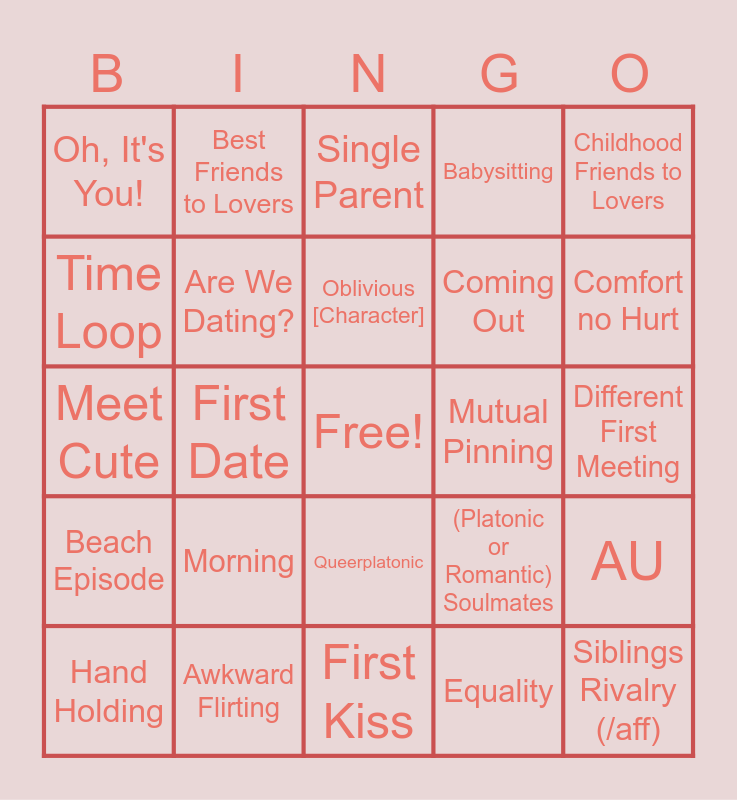 This bingo card has a free space and 24 words: Hand Holding, Morning, Oblivious [Character], Equality, Childhood Friends to Lovers, Oh, It's You!, Best Friends to Lovers, Single Parent, Mutual Pinning, Different First Meeting, Meet Cute, Are We Dating?, (Platonic or Romantic) Soulmates, AU, Time Loop, Awkward Flirting, First Kiss, Babysitting, Comfort no Hurt, Beach Episode, First Date, Queerplatonic, Coming Out and Siblings Rivalry (/aff).