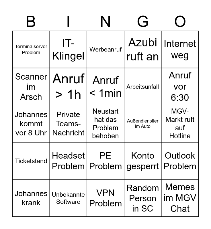This bingo card has 25 words: Headset Problem, VPN Problem, Anruf < 1min, Johannes krank, Internet weg, Terminalserver Problem, Scanner im Arsch, IT-Klingel, Außendienstler im Auto, PE Problem, Arbeitsunfall, Johannes kommt vor 8 Uhr, Konto gesperrt, Outlook Problem, Anruf > 1h, Memes im MGV Chat, MGV-Markt ruft auf Hotline, Werbeanruf, Anruf vor 6:30, Private Teams-Nachricht, Neustart hat das Problem behoben, Unbekannte Software, Ticketstand, Azubi ruft an and Random Person in SC.