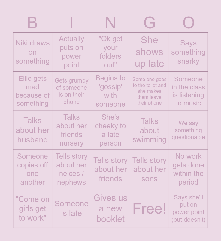 This bingo card has 32 words: Free!, Posts something to Google classroom, Talks about her friends nursery, Talks about a trip she has been on, Someone copies off one another, Gets grumpy of someone is on their phone, Says something snarky, No work gets done within the period, Actually puts on power point, Says she'll put on power point (but doesn't), Begins to 'gossip' with someone, "Ok get your folders out", "Ok so daisy is gonna join you guys for today", "Just give me a minute I need to print something off", Talks about swimming, "And what are we doing here?", "Come on girls get to work", Talks about her husband, Tells story about her friends, Tells story about her neices / nephews, Tells story about her sons, She says something questionable, We say something questionable, Someone is late, She's cheeky to a late person, She shows up late, Some one goes to the toilet and she makes them leave their phone, Ellie gets mad because of something, Niki draws on something, Gives us a new booklet, We all sit on our phones and Someone in the class is listening to music.