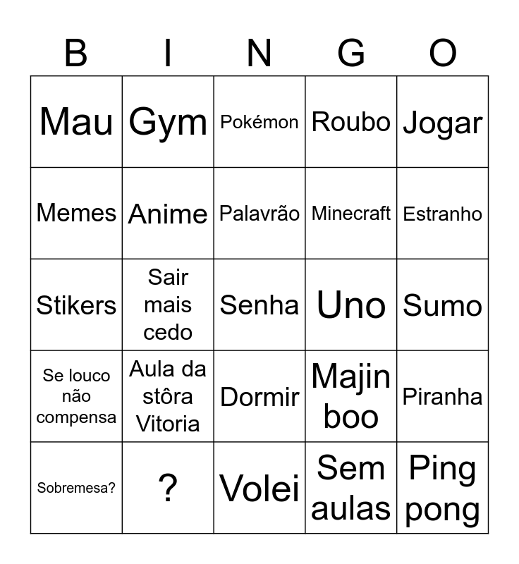 This bingo card has 35 words: Sono, Clash, Lucas atrasado, Anime, Dormir, Roubo, Memes, Piada de merda, Palavrão, Parabéns, Stikers, Jogar, ACI, Lucas meio a dormir, Mau, Uno, Sem aulas, Sair mais cedo, Se louco não compensa, Senha, Majin boo, Sobremesa?, Piranha, ?, Pokémon, Estranho, Ping pong, Matrecos, Minecraft, Sumo, Molhos, Volei, Aula da stôra Vitoria, Gym and Deu merda.