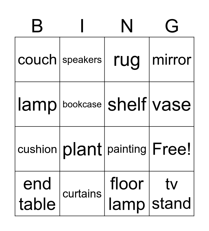 This bingo card has 20 words: Free!, coffee table, rug, armchair, end table, lamp, curtains, couch, cushion, speakers, plant, painting, bookcase, tv stand, shelf, chandelier, vase, mirror, floor lamp and books.