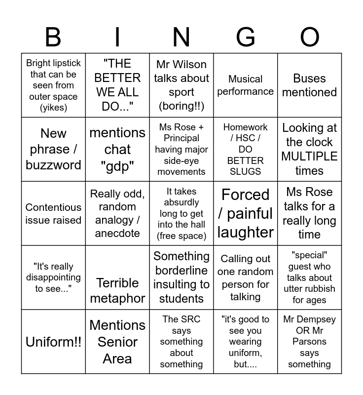 This bingo card has a free space and 24 words: Terrible metaphor, Mentions Senior Area, Ms Rose + Principal having major side-eye movements, Uniform!!, Buses mentioned, Bright lipstick that can be seen from outer space (yikes), New phrase / buzzword, "THE BETTER WE ALL DO...", Forced / painful laughter, Something borderline insulting to students, Homework / HSC / DO BETTER SLUGS, Contentious issue raised, Calling out one random person for talking, "special" guest who talks about utter rubbish for ages, mentions chat "gdp", "it's good to see you wearing uniform, but...., Ms Rose talks for a really long time, Mr Wilson talks about sport (boring!!), Looking at the clock MULTIPLE times, Really odd, random analogy / anecdote, Mr Dempsey OR Mr Parsons says something, "It's really disappointing to see...", Musical performance and The SRC says something about something.
