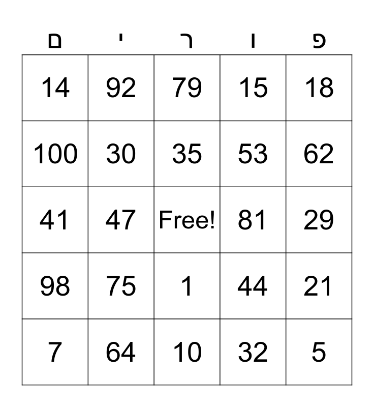 This bingo card has a free space and 24 words: 75, 64, 35, 7, 18, 14, 100, 92, 81, 1, 53, 41, 44, 21, 30, 32, 29, 79, 62, 47, 5, 98, 15 and 10.