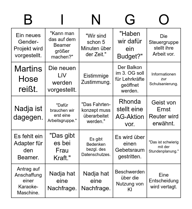 ⚠ This card has duplicate items: Den examinierten LiV wird gratiuliert. (2), "Wir sind schon 5 Minuten über der Zeit." (2), Eine Lehrkraft kommt zu spät. (2), "Dafür brauchen wir erst eine Arbeitsgruppe." (2), Dem Protokoll der letzten Geko wird zugestimmt. (2), "Kann man das auf dem Beamer größer machen?" (2), Es wird eine Frage gestellt um ein Kreuz im Bingo machen zu können. (2), "Wir haben Zeit gut gemacht." (2), Schlechte Leistungen der Schüler*innen werden angesprochen. (2), Es wird über einen Gebetsraum gestritten. (2), "Das ist schwierig mit der Stundenplanung." (2), "Haben wir dafür ein Budget?" (2), Ein neues Gender-Projekt wird vorgestellt. (2), "Braucht noch jemand die Anwesenheits-liste?" (2), Martins Hose reißt. (2), Wiebke macht eine Fußball-Analogie. (2), "Das gibt es bei Frau Kraft." (2), Technikprobleme mit dem Beamer. (2), Geist von Ernst Reuter wird erwähnt. (2), Es gibt Bedenken bezgl. des Datenschutzes. (2), Die Steuergruppe stellt ihre Arbeit vor. (2), Nadja ist dagegen. (2), Eistimmige Zustimmung. (2), Die neuen LiV werden vorgestellt. (2), Jemand befürchtet selbst etwas organisieren zu müssen. (2), Beschwerden über faule Schüler*innen (2), Der Ablauf der BO-Wochen wird präsentiert. (2), Jemand erhält eine Ernennungs-urkunde. (2), "Die Ernennungs-urkunde war leider noch nicht fertig gedruckt." (2), Informationen zur Schulsanierung. (2), Es fehlt ein Adapter für den Beamer. (2), Nadja hat eine Nachfrage. (2), Eine Entscheidung wird vertagt. (2), Antrag auf Anschaffung einer Karaoke-Maschine. (2), Rhonda stellt eine AG-Aktion vor. (2), "Das findet ihr im Schulportal." (2), Beschwerden über die Nutzung von KI (2), Eine Lehrkraft verlässt vorzeitig die GeKo. (2), Der Balkon im 3. OG soll für Lehrkräfte geöffnet werden. (2), "Das Fahrten-konzept muss überarbeitet werden." (2)