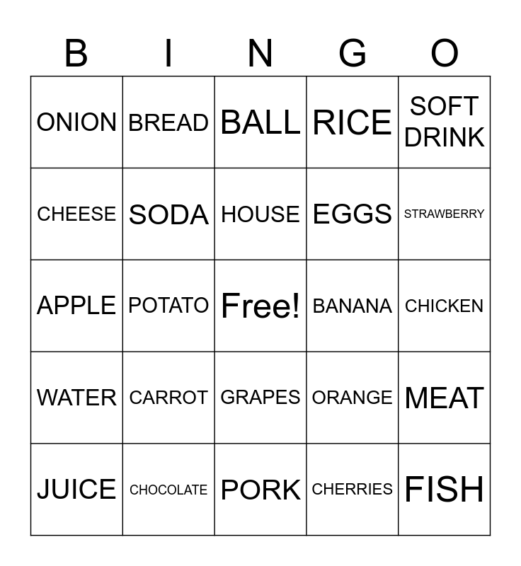 This bingo card has a free space and 33 words: HAMBURGUER, FRENCH FRIES, POTATO, TOMATO, WATER, SODA, SOFT DRINK, JUICE, BREAD, MILK, HOUSE, BALL, TABLE, CHAIR, BANANA, STRAWBERRY, CHOCOLATE, APPLE, CARROT, ORANGE, GRAPES, LETTUCE, ONION, CHICKEN, PORK, FISH, RICE, EGGS, CHEESE, MEAT, ONION, CHERRIES and LEMON.
