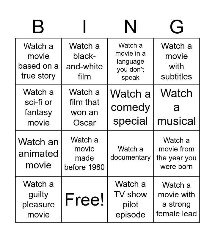 This bingo card has 16 words: Free!, Watch a movie from the year you were born, Watch a movie in a language you don’t speak, Watch a movie based on a true story, Watch an animated movie, Watch a black-and-white film, Watch a documentary, Watch a TV show pilot episode, Watch a sci-fi or fantasy movie, Watch a film that won an Oscar, Watch a guilty pleasure movie, Watch a movie with subtitles, Watch a movie made before 1980, Watch a musical, Watch a comedy special and Watch a movie with a strong female lead.