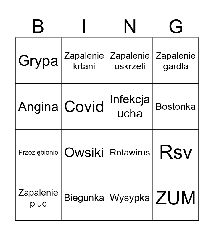 This bingo card has 16 words: Biegunka, Rsv, Zapalenie oskrzeli, Grypa, Przeziębienie, Zapalenie krtani, Rotawirus, Wysypka, Angina, Covid, Zapalenie pluc, Zapalenie gardla, Owsiki, Bostonka, Infekcja ucha and ZUM.