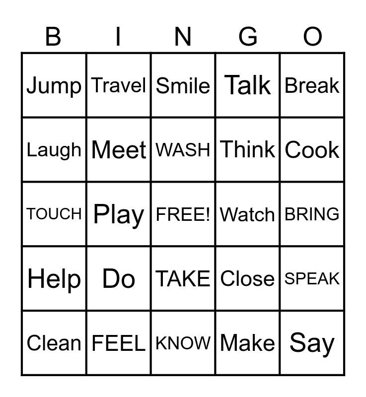 This bingo card has a free space and 89 words: PLAY, GO, TAKE, THINK, GET, LEND, UNDERSTAND, WALK, BUY, DO, DRINK, SEE, SPEAK, BRING, READ, WASH, CUT, WRITE, SWIM, LOOK, MAKE, JUMP, KNOW, DRIVE, TOUCH, FEEL, LIKE, SHOW, SING, Walk, Talk, Play, Call, Jump, Work, Smile, Laugh, Dance, Cook, Clean, Help, Live, Move, Open, Close, Watch, Listen, Learn, Study, Travel, Answer, Enter, Exit, Type, Visit, Accept, Follow, Plan, Need, Go, Come, Eat, Drink, Sing, Drive, Take, Give, Have, Be, Do, Say, See, Know, Think, Meet, Make, Keep, Sleep, Stand, Fly, Break, Choose, Draw, Speak, Fall, Wear, Rise, Write and Run.
