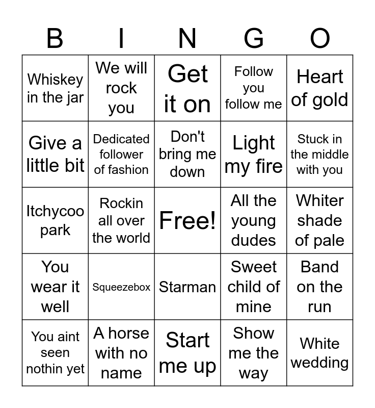 This bingo card has a free space and 29 words: You aint seen nothin yet, Sultans of swing, Rockin all over the world, The Joker, Whiskey in the jar, Get it on, Dedicated follower of fashion, Squeezebox, All the young dudes, A horse with no name, Whiter shade of pale, White wedding, Start me up, Show me the way, Stuck in the middle with you, Nights in white satin, Starman, You wear it well, Heart of gold, Itchycoo park, Sweet child of mine, Long train runnin, Light my fire, Give a little bit, Follow you follow me, We will rock you, Band on the run, Don't bring me down and All right now.