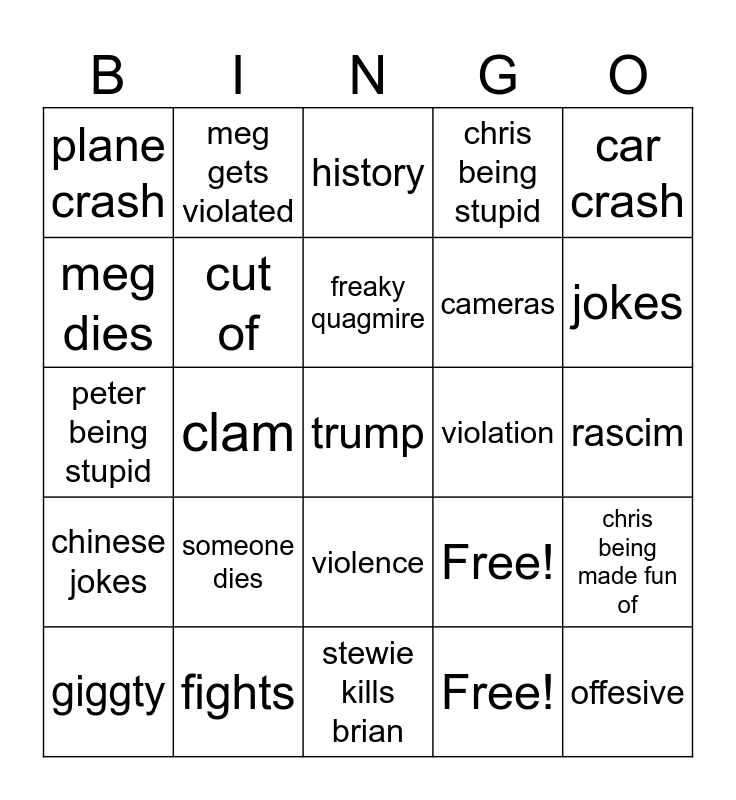 This bingo card has 25 words: someone dies, stewie kills brian, freaky quagmire, giggty, car crash, plane crash, meg dies, meg gets violated, violation, violence, cameras, peter being stupid, Free!, chris being made fun of, cut of, offesive, rascim, history, jokes, clam, trump, fights, chinese jokes, chris being stupid and Free!.