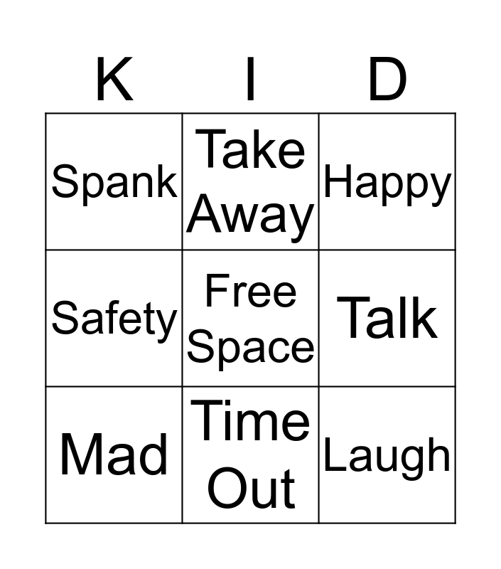 This bingo card has a free space and 8 words: Talk, Happy, Take Away, Mad, Spank, Laugh, Safety and Time Out.