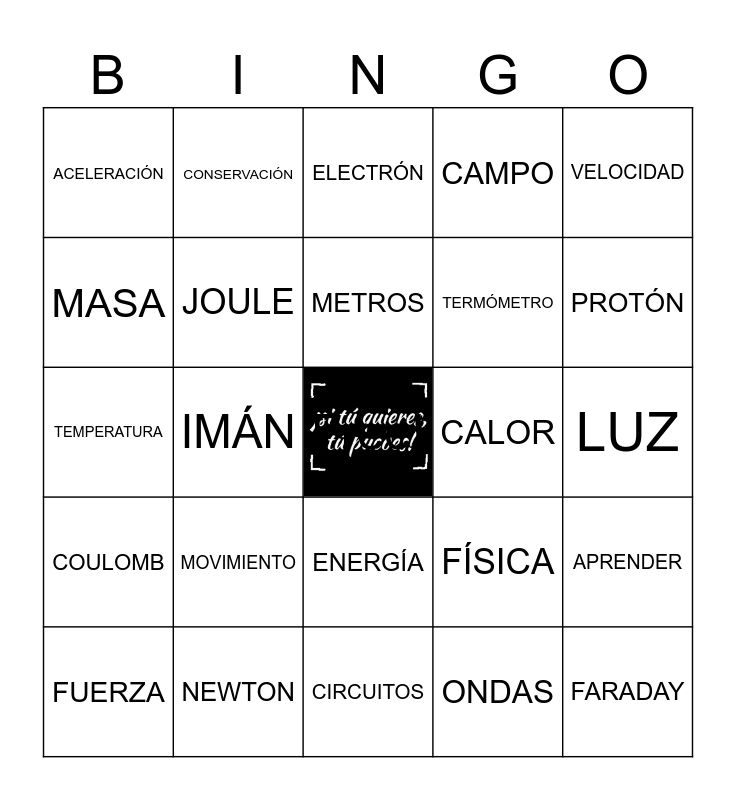 This bingo card has a free space and 24 words: MOVIMIENTO, NEWTON, METROS, FUERZA, VELOCIDAD, ACELERACIÓN, MASA, CONSERVACIÓN, CALOR, ENERGÍA, TERMÓMETRO, TEMPERATURA, FÍSICA, APRENDER, JOULE, ONDAS, LUZ, ELECTRÓN, PROTÓN, IMÁN, FARADAY, COULOMB, CAMPO and CIRCUITOS.