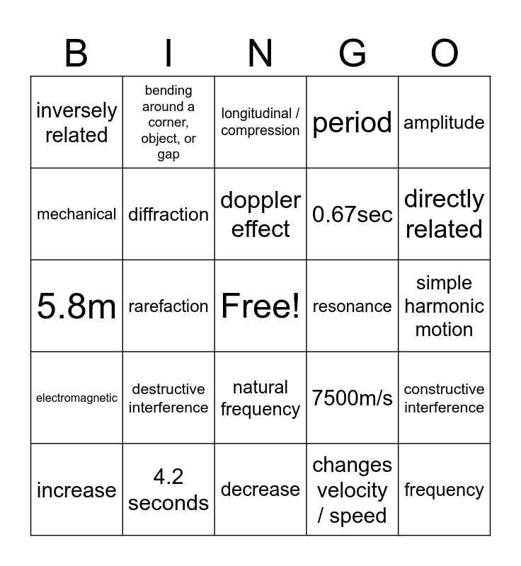 This bingo card has a free space and 37 words: reflection, refraction, interference, diffraction, constructive interference, destructive interference, doppler effect, wavelength, amplitude, compression, rarefaction, period, frequency, simple harmonic motion, mechanical, electromagnetic, transverse, longitudinal / compression, natural frequency, resonance, inversely related, directly related, increase, decrease, echolocation, changes velocity / speed, bending around a corner, object, or gap, bounces off an object, moving from one medium to another / boundary, larger amplitude, smaller amplitude, 4.2 seconds, 5.8m, 14.2m/s, 7500m/s, 0.67sec and 65.3m.