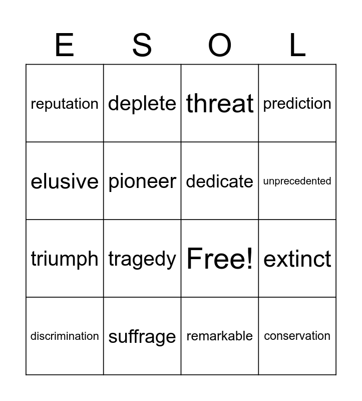 This bingo card has 19 words: Free!, endangered, threat, conservation, extinct, elusive, remarkable, reputation, deplete, triumph, tragedy, pioneer, dedicate, suffrage, discrimination, activist, prediction, unprecedented and revenue.