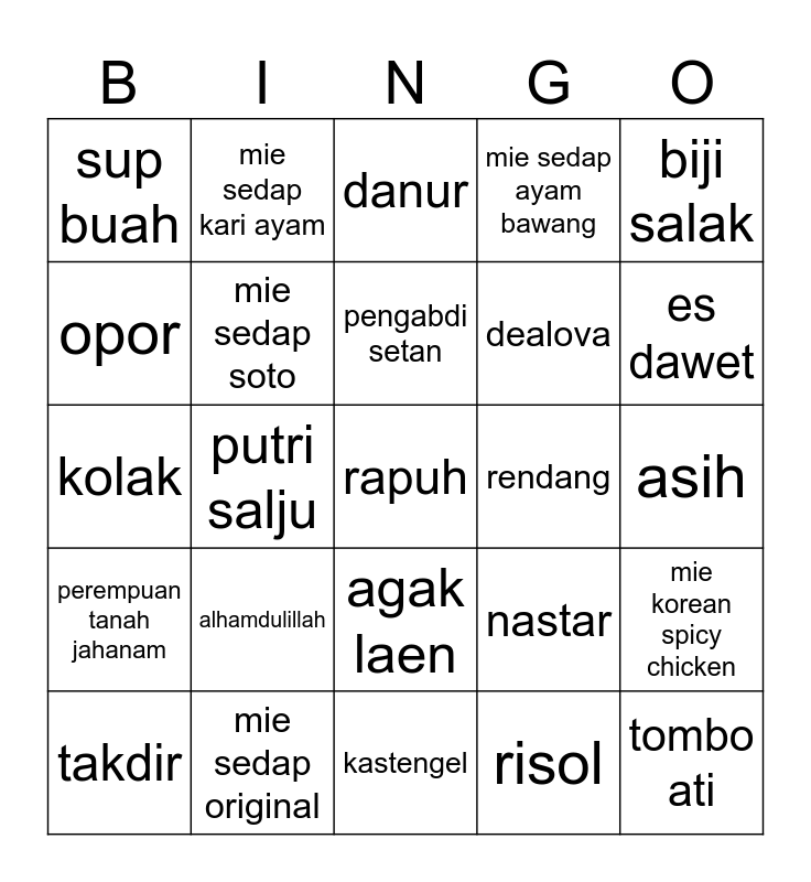 This bingo card has a free space and 24 words: alhamdulillah, mie sedap original, pengabdi setan, takdir, biji salak, sup buah, opor, mie sedap kari ayam, rendang, agak laen, dealova, kolak, nastar, mie korean spicy chicken, mie sedap soto, risol, asih, danur, es dawet, putri salju, tombo ati, perempuan tanah jahanam, mie sedap ayam bawang and kastengel.