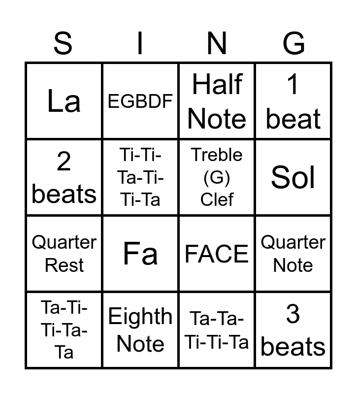 This bingo card has 16 words: Eighth Note, Quarter Note, Half Note, La, Quarter Rest, EGBDF, FACE, Ta-Ta-Ti-Ti-Ta, 2 beats, Ti-Ti-Ta-Ti-Ti-Ta, Ta-Ti-Ti-Ta-Ta, 1 beat, Fa, Sol, Treble (G) Clef and 3 beats.