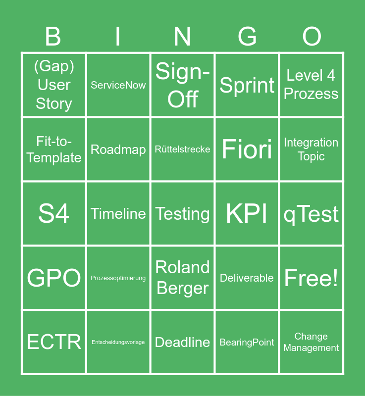 This bingo card has 26 words: Roland Berger, BearingPoint, Rüttelstrecke, Entscheidungsvorlage, Level 4 Prozess, (Gap) User Story, Fit-to-Template, ServiceNow, qTest, Deliverable, Fiori, S4, Free!, ECTR, Timeline, Go-Live, Sprint, GPO, Sign-Off, Testing, Integration Topic, Deadline, KPI, Prozessoptimierung, Roadmap and Change Management.