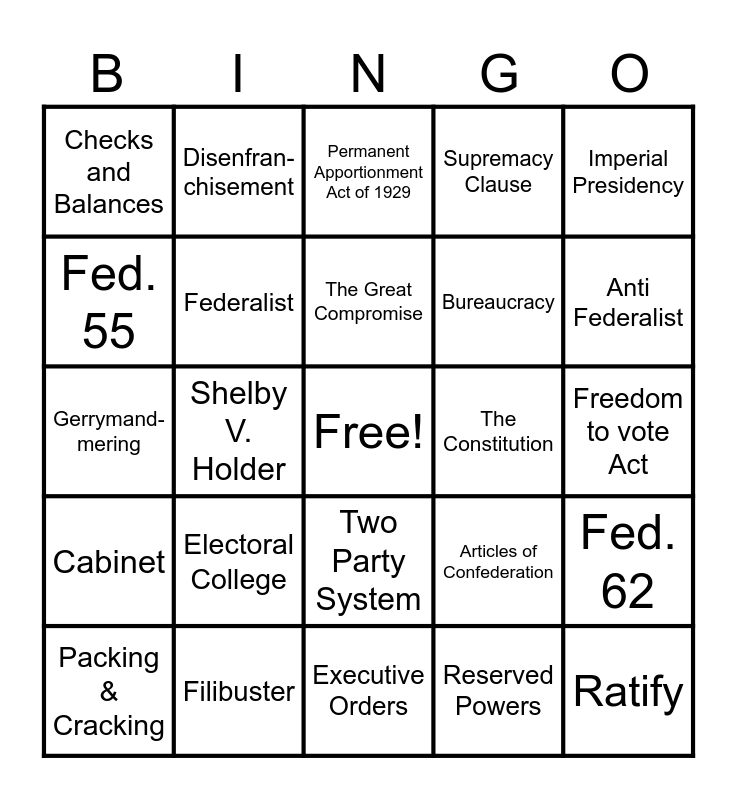 This bingo card has a free space and 24 words: Electoral College, Filibuster, The Great Compromise, Packing & Cracking, Imperial Presidency, Checks and Balances, Fed. 55, Disenfran- chisement, The Constitution, Two Party System, Bureaucracy, Gerrymand- mering, Articles of Confederation, Fed. 62, Federalist, Reserved Powers, Freedom to vote Act, Permanent Apportionment Act of 1929, Anti Federalist, Shelby V. Holder, Ratify, Cabinet, Supremacy Clause and Executive Orders.