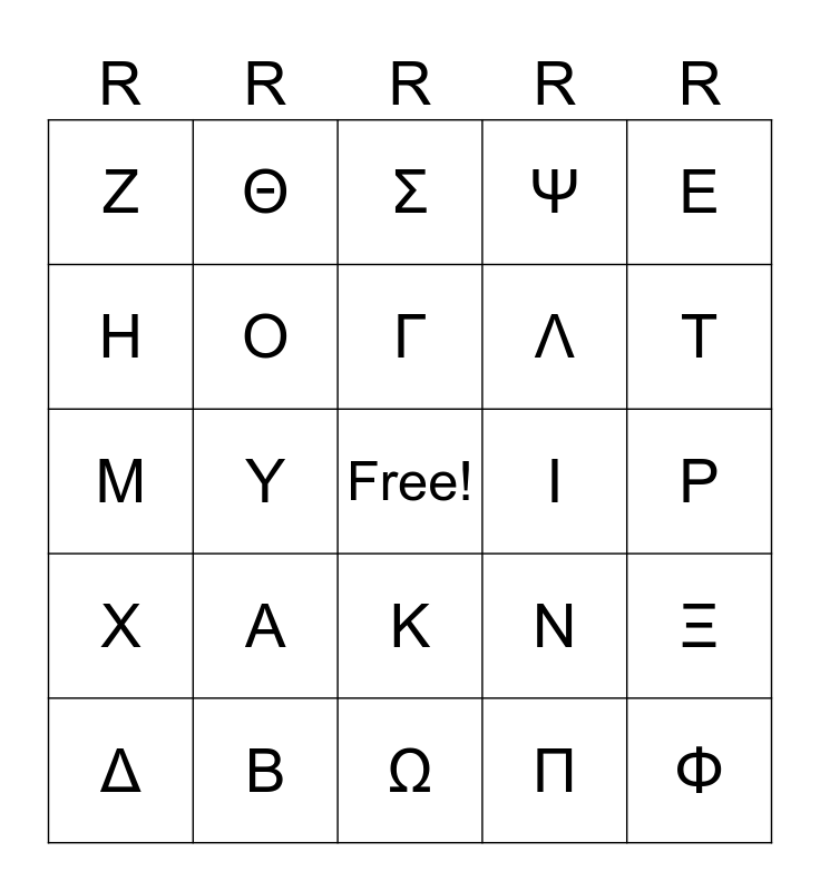 This bingo card has a free space and 24 words: A, B, Γ, Δ, E, Z, H, Θ, I, K, Λ, M, N, Ξ, O, Π, P, Σ, T, Y, Φ, X, Ψ and Ω.