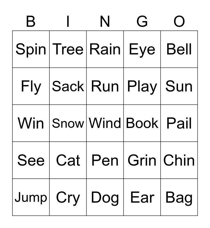 This bingo card has 25 words: Cat, Dog, Run, Jump, Bell, Spin, Fly, Tree, Book, Pen, Play, Win, Grin, Chin, Sack, Bag, Pail, Rain, Sun, Snow, Wind, Cry, See, Eye and Ear.