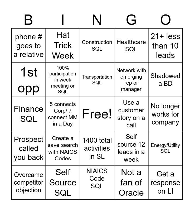 This bingo card has a free space and 24 words: Create a save search with NAICS Codes, Self Source SQL, Transportation SQL, Overcame competitor objection, 21+ less than 10 leads, phone # goes to a relative, 1st opp, Hat Trick Week, Use a customer story on a call, 1400 total activities in SL, Network with emerging rep or manager, Finance SQL, Self source 12 leads in a week, Energy/Utility SQL, 100% participation in week meeting or SQL, Not a fan of Oracle, No longer works for company, Construction SQL, Shadowed a BD, 5 connects Corp/ 7 connect MM in a Day, Get a response on LI, Prospect called you back, Healthcare SQL and NIAICS Code SQL.