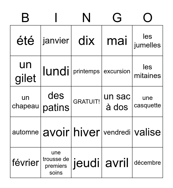 This bingo card has a free space and 34 words: mercredi, avril, neuf, juin, automne, lundi, les jumelles, février, janvier, un bouteille d'eau, printemps, dix, mars, les lunettes de soleil, un sac à dos, les mitaines, une trousse de premiers soins, un chapeau, avoir, vendredi, hiver, écharpe, été, une casquette, jeudi, décembre, mai, onze, excursion, un gilet, un tuque, des patins, valise and vingt.
