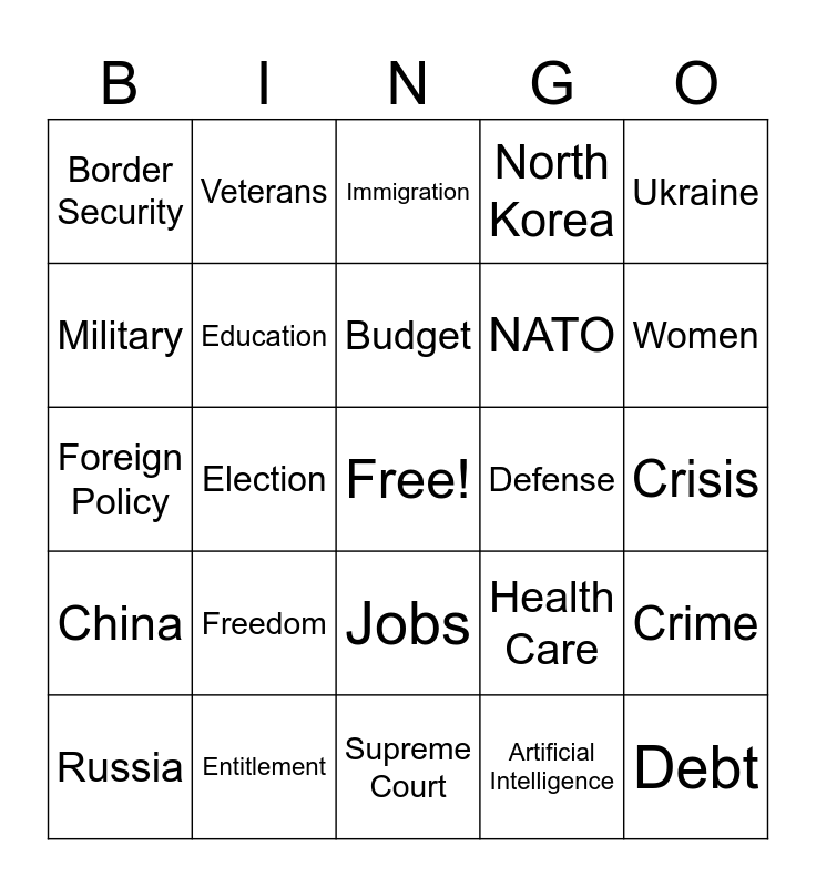 This bingo card has a free space and 29 words: Russia, Economy, Election, Inflation, Border Security, Immigration, Education, Freedom, Defense, Entitlement, Crisis, Debt, Supreme Court, Artificial Intelligence, Women, Employment, Jobs, China, Ukraine, Foreign Policy, Health Care, National Security, NATO, Military, North Korea, Veterans, Crime, Budget and Bipartisan.